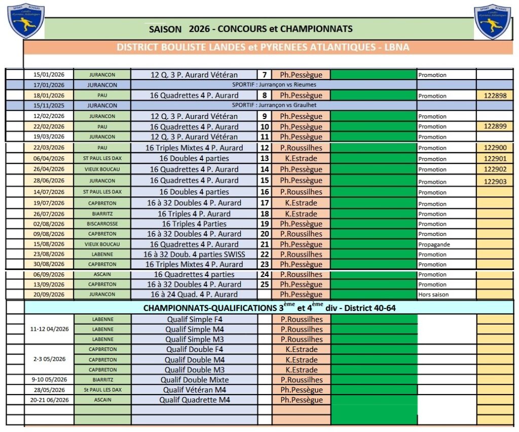 Concours et Championnats District Bouliste Landes et Pyrénées Atlantiques 2026